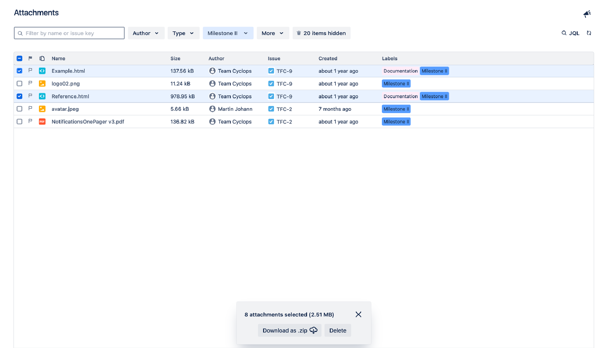 Just select the attachments of up to 60k issues to quickly download or delete them.