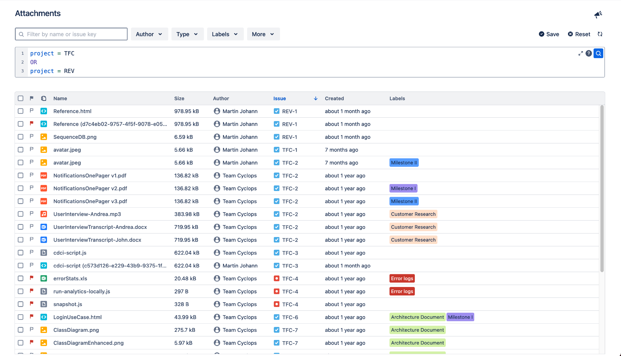 Through the flexibility of JQL you can pull the attachments of any issue or project into a single table.